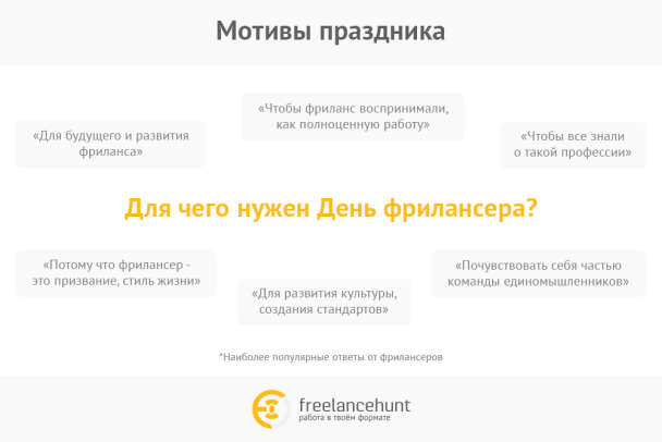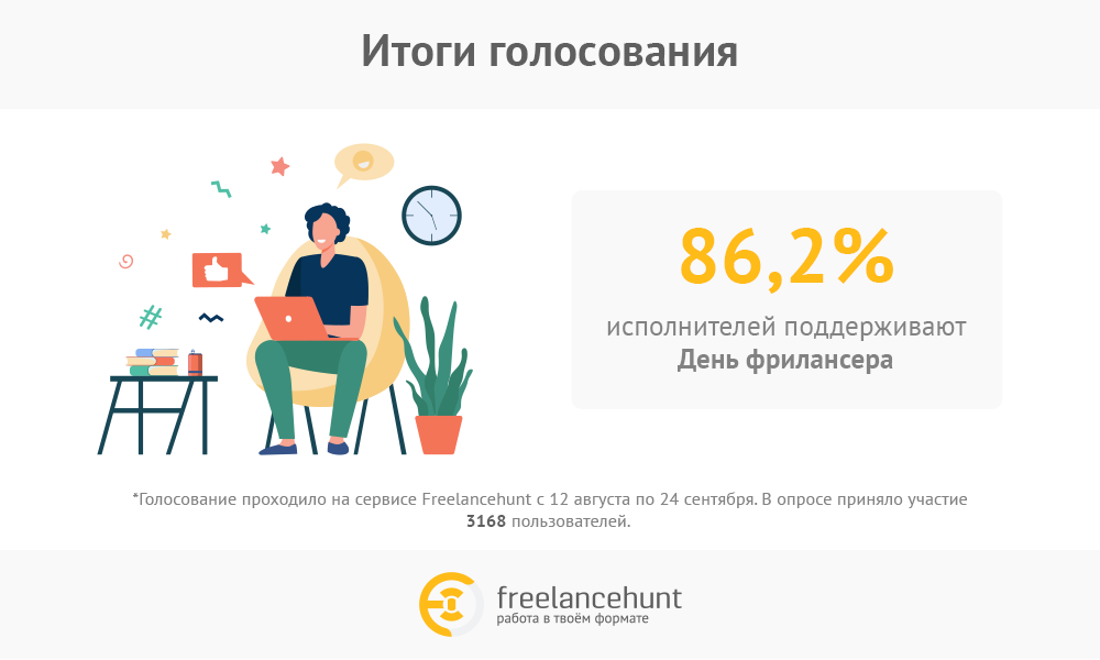 Большинство украинских фрилансеров выступает за создание профессионального праздника. Согласно данным опроса крупнейшего сервиса удаленной работы Freelancehunt, 86,2% пользователей высказались за то, чтобы в Украине отмечался День фрилансера.