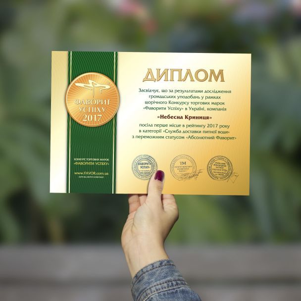 Конкурс торговых марок "Фавориты Успеха" подвел итоги исследования общественных предпочтений, которое проводилось в течение 2017 года с целью определения лучших, наиболее рекомендуемых экспертами и любимых потребителями торговых марок украинского рынка. Среди 24 участников рынка доставки питьевой воды лучшей названа ТМ "Небесна Криниця".